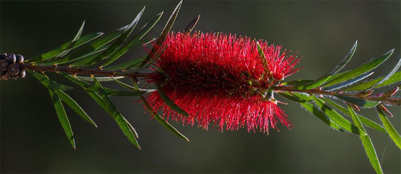 the green of the pine tree, the red of the bottle-brush bushes, and the