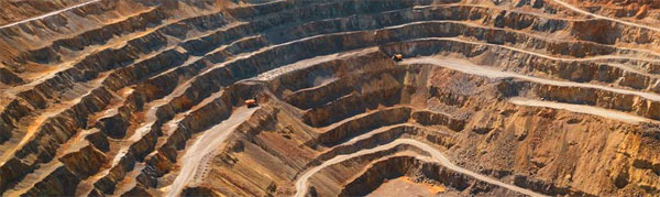 In Africa, most copper production comes from open-pit mining. Over time, a series of stepped benches is dug deeper and deeper into the earth. To dislodge the ore, boring machines drill holes in the hard rock of these benches, and explosives are inserted into the drill holes, in order to shatter the rock.