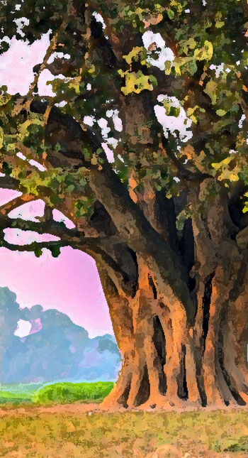 Against Maali’s instructions, Bhumi keeps her bedroom window open, watching the sun sink behind the massive banyan tree in the distance. Mogra, chameli, and raat rani seem to melt into the orange glow of the setting sun. The banyan tree resembles the Tree of Life from The Fountain. The setting sun aligns perfectly as it descends behind the massive banyan tree. Two rows of tall eucalyptus trees on either side of the road appear to drip and dissolve in the molten orange light. The banyan tree stands at the T-point, connected by a narrow road to the massive main gate of their British-style bungalow.
