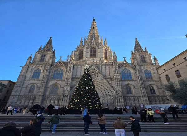 With clean clothes on the horizon, we decided to revisit familiar places rather than chase new ones. First stop: Barcelona’s main cathedral—Catedral de la Santa Creu i Santa Eulàlia, more commonly known as La Seu—standing proudly in the heart of the Gothic Quarter. A tall, beautifully decorated Christmas tree graced the entrance, adding a festive flourish and presenting the perfect photo opportunity.