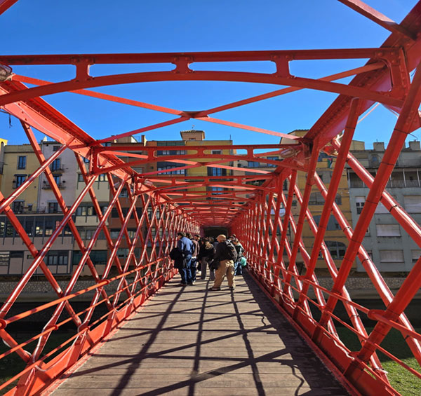 The walk into the Old City began along a red-carpeted alley, mysterious at first, but extremely helpful when retracing our steps later. Crossing the Pont de Pedra over the Onyar River, we entered the historic Barri Vell. The river, choked with weeds, flows south to north and is crossed by several bridges—the best was left for the last, the iconic Eiffel Bridge, built in 1877 by Gustave Eiffel’s company. Bright red, lattice-iron, and utterly photogenic. I think Miquel did this for a particular reason. Ending the tour with a dramatic flourish.