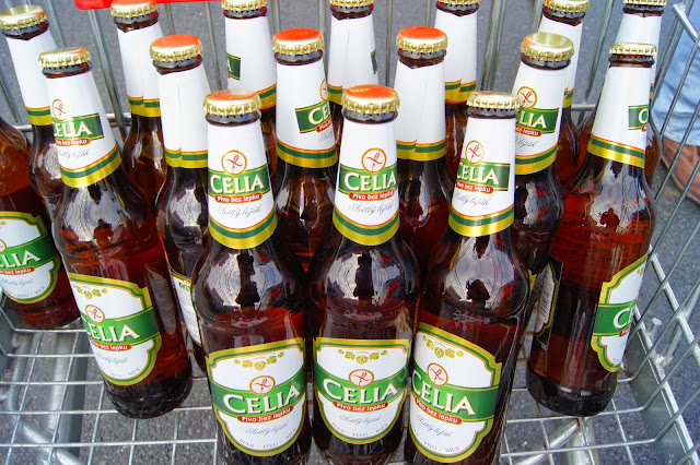 On the way home from the brewery we stopped at Kaufland, a German supermarket chain, to see what they had in the way of gluten-free products. I won't keep you in suspense. They had Celia. Eighteen bottles. At first, Sebastian the Wishing Well Attendant insisted on putting all 18 bottles into our shopping cart, but then I wisely suggested trying a bottle of the stuff before we committed to the whole lot. So with one bottle of beer in our cart, we made our way to the check-out lanes.